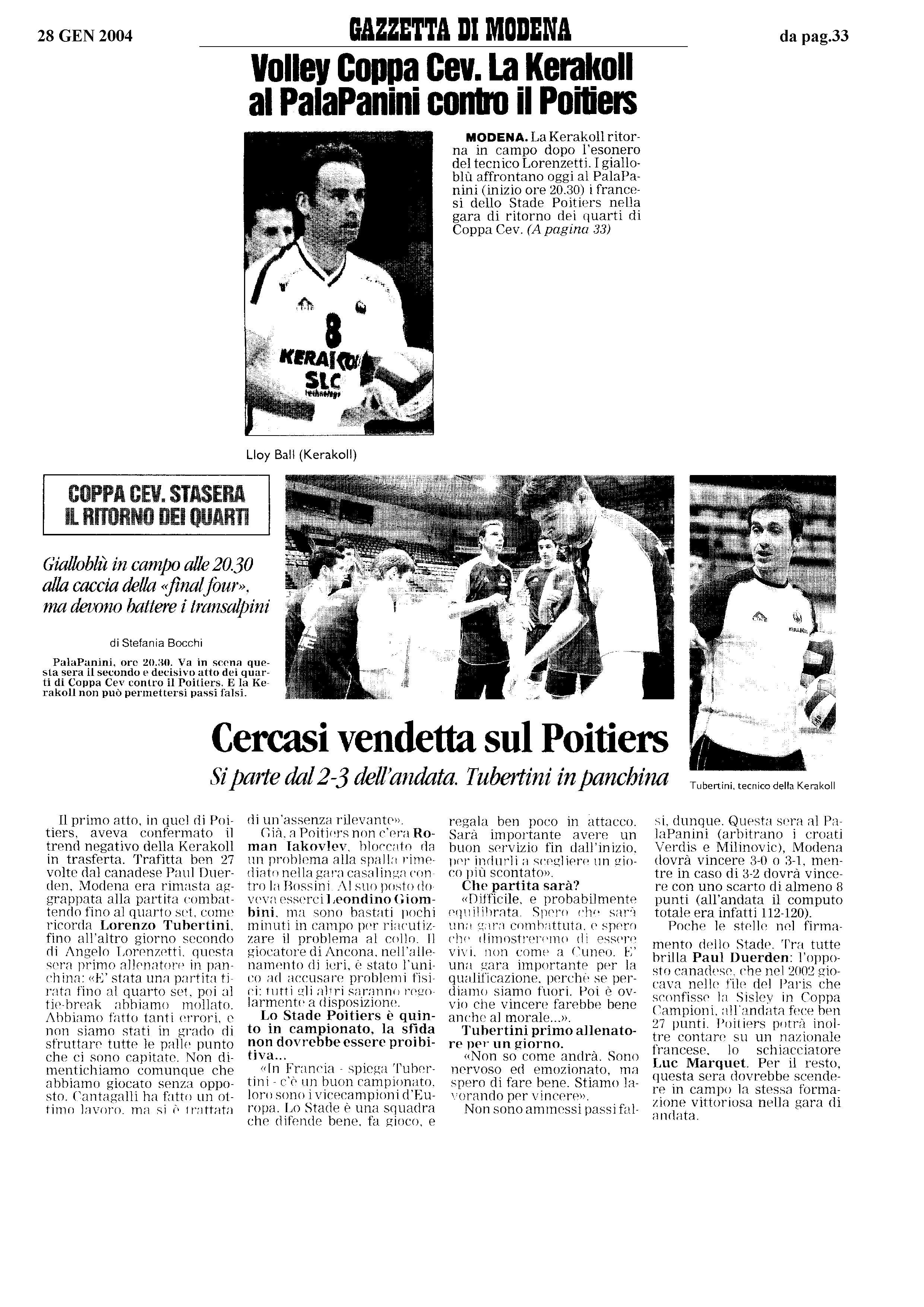 Il 2004 è l’anno in cui un mito della pallavolo italiana e mondiale, Andrea Giani, vince il suo ultimo trofeo da giocatore. E il 2004 è anche l’anno in cui, un giovane assistente allenatore, quasi coetaneo del “Giangio”, conquista il suo primo trofeo. E’ la bella storia di due quarantenni, Andrea Giani e Lorenzo Tubertini, che si sfideranno per la prima volta in panchina domani sera, sotto i riflettori di Rai Sport, nel secondo anticipo della settima giornata del Campionato di SuperLega UnipolSai tra Revivre Milano e Tonno Callipo Calabria Vibo Valentia. Due volti della pallavolo che hanno, ricoprendo ruoli diversi, vinto insieme la Coppa Cev del 2004 con la Kerakoll Modena. Stagione difficile quella degli emiliani all’epoca con risultati altalenanti e con l’esonero di Angelo Lorenzetti arrivato a fine gennaio dopo il ko in trasferta contro Cuneo. Assistente dell’attuale coach di Trento c’era un giovane modenese che proveniva dall’universo della pallavolo femminile, quel Lorenzo Tubertini che si è affacciato quest’anno per la prima volta nel ruolo di head-coach di una squadra di SuperLega dopo tanti anni di dura gavetta. E nel trapasso tra l’addio di Lorenzetti e il subentro in panchina del Prof. Menarini, toccò proprio a Tubertini, all’epoca trentunenne, prendere le redini della panchina di Modena per una notte. Una notte europea, quella che metteva in palio la qualificazione alla Final Four di Coppa Cev, una notte in cui Modena non avrebbe potuto fare passi falsi dopo il ko nel match di andata contro i francesi del Poitiers. Era la Modena dei Ball e dei Cantagalli, dei Iakovlev e dei Dante, dei Pippi e degli ex giallorossi Cozzi e Cernic. Era la Modena, soprattutto, di un giocatore come Andrea Giani, capitano e leader della Kerakoll. “E’ stato un passaggio molto difficile, ricordo di un ambiente in cui ovviamente tutti noi eravamo messi sotto pressione. L’addio di Angelo (Lorenzetti ndc) – afferma coach Lorenzo Tubertini – non mi diede ovviamente gioia perché fu lui a volermi nel suo staff alla guida di un club come Modena. Si chiuse un capitolo e se ne aprì un altro con la società che mi diede la grandissima opportunità di guidare la squadra fino all’arrivo di Menarini. Mi presi di coraggio quella sera della partita di Coppa, entrai nello spogliatoio e davanti a me c’era Lloy Ball. Feci un bel respiro e iniziai un discorso ai ragazzi chiedendo loro una partita di umiltà e coraggio. Il mio compito finì in quel momento perché la risposta in campo fu ottima, giocammo una buona partita e io non dovetti né operare cambi, né chiamare time-out. Con Andrea Giani – sottolinea il coach della Tonno Callipo – c’è sempre stato un ottimo rapporto, lui rappresenta una generazione di uomini e di pallavolisti che hanno fatto la storia di questo sport, una persona che ho avuto il privilegio di conoscere bene e di allenare, nel ruolo di assistente di Lorenzetti e Velasco, per tre stagioni. Sarà bello ed emozionante affrontarlo da avversario in panchina”. Una bella pagina di storia pallavolistica, della quale di seguito vi proponiamo il tabellino della partita di Coppa Cev in cui, per la prima volta, Lorenzo Tubertini ha vestito i panni del primo allenatore: